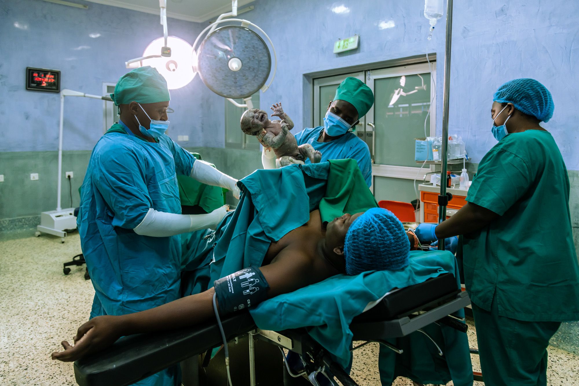 Doctor Yassin holds up Beata’s* baby, Beni*, following a successful caesarean section at a medical facility run by Save the Children in Mahama Refugee Camp, Rwanda. Photographer: Yagazie Emezi. @yagazieemezi