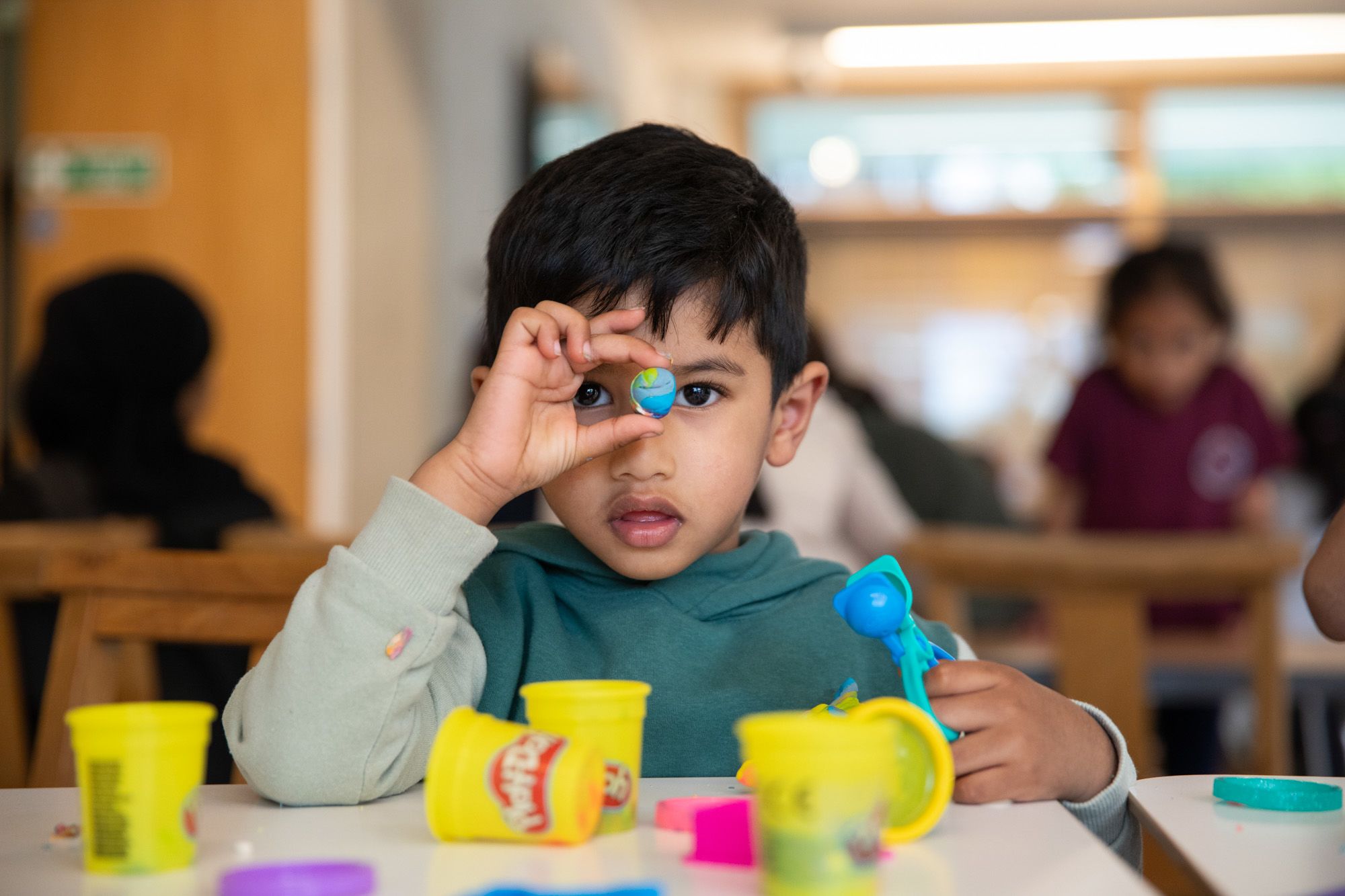 Ibrahim, four, with Play-Doh at a Lego Play Innovation Lab in Tower Hamlets, London. Photographer: Kate Stanworth. @katestanworth
