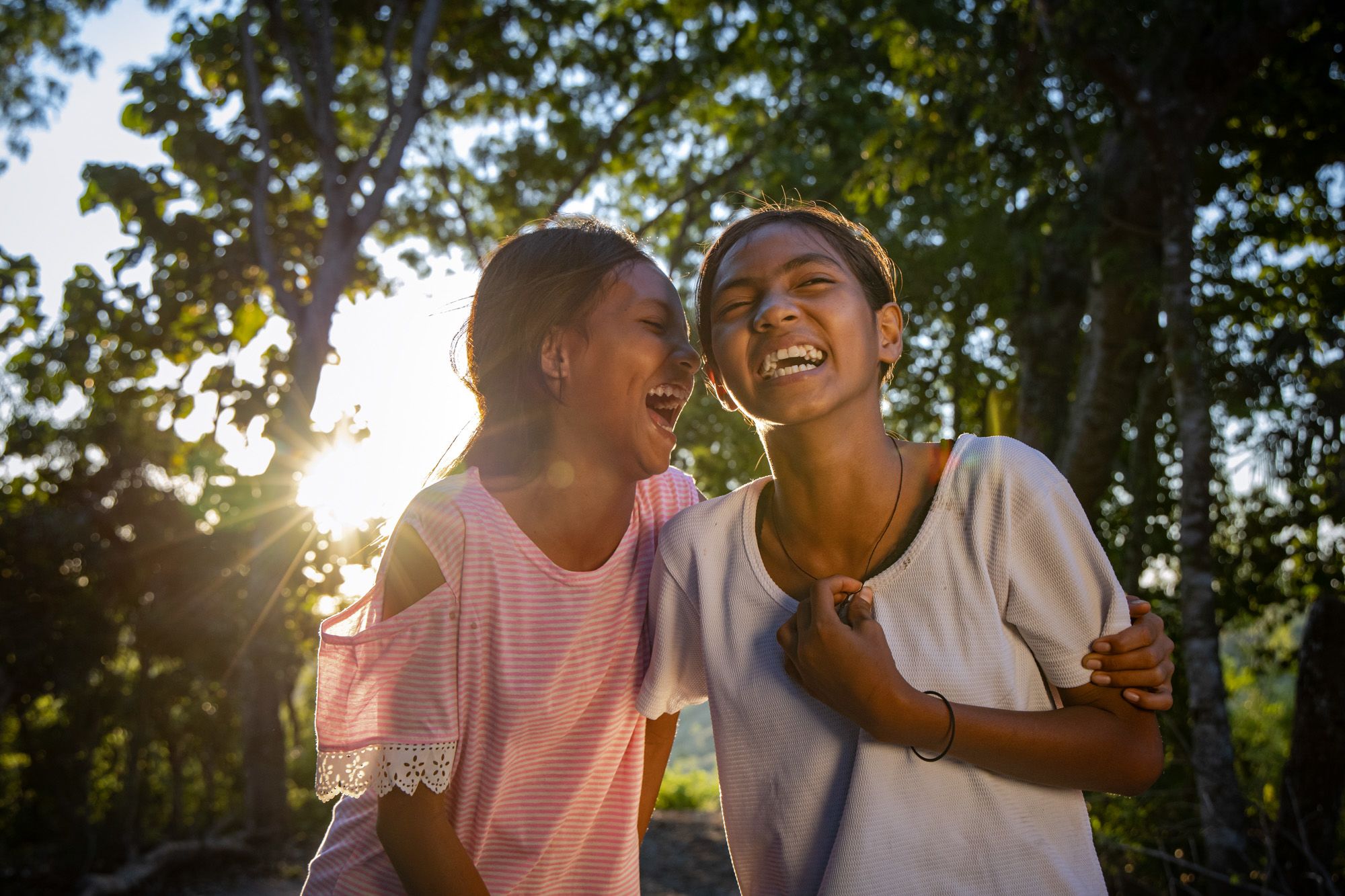 “Atika and Dwi had been collecting water with jerry cans from a new solar-powered water system Save the Children had built in their community. Drought and water shortages are common in East Sumba, particularly during the dry season. They stopped for this photograph whilst walking back home. It was the golden hour, and the sun was setting behind them, so we decided to shoot into the light. I used a reflector to bounce the light on their face. We were talking about something and they just burst into laughter, it was a just very natural moment to capture.”