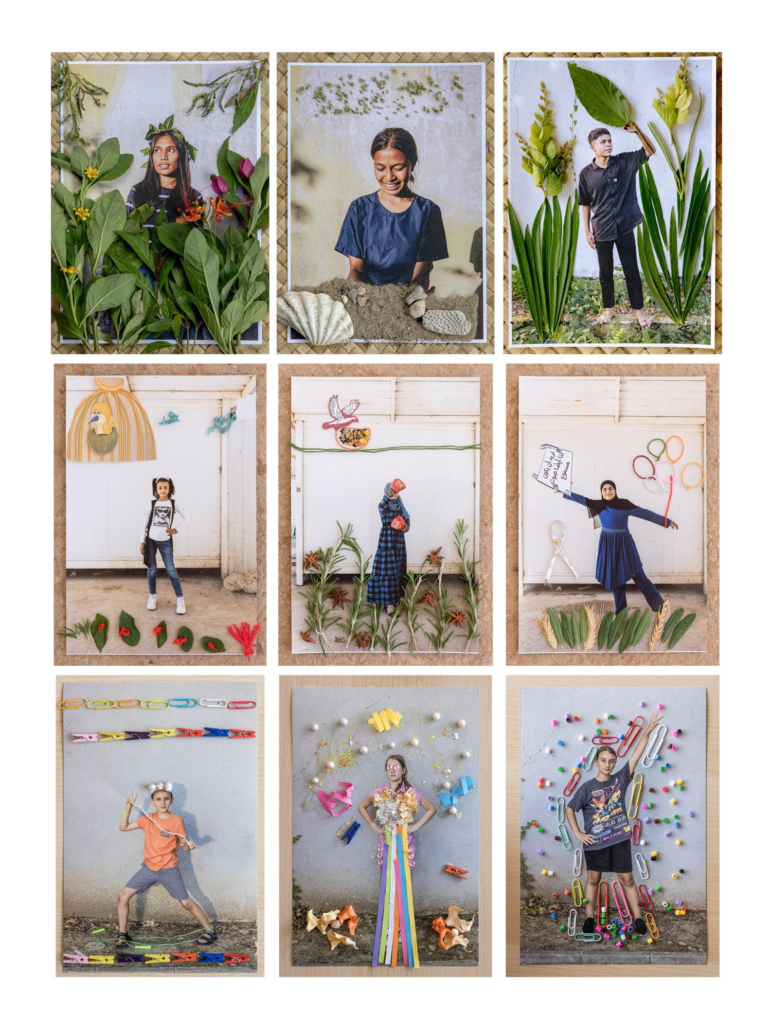 Mixed media collages created by the children pictured, in Indonesia (top row), Jordan (middle) and Ukraine (bottom). Photographers: Ulet Ifansasti, Kate Stanworth, and Oksana Parafeniuk.