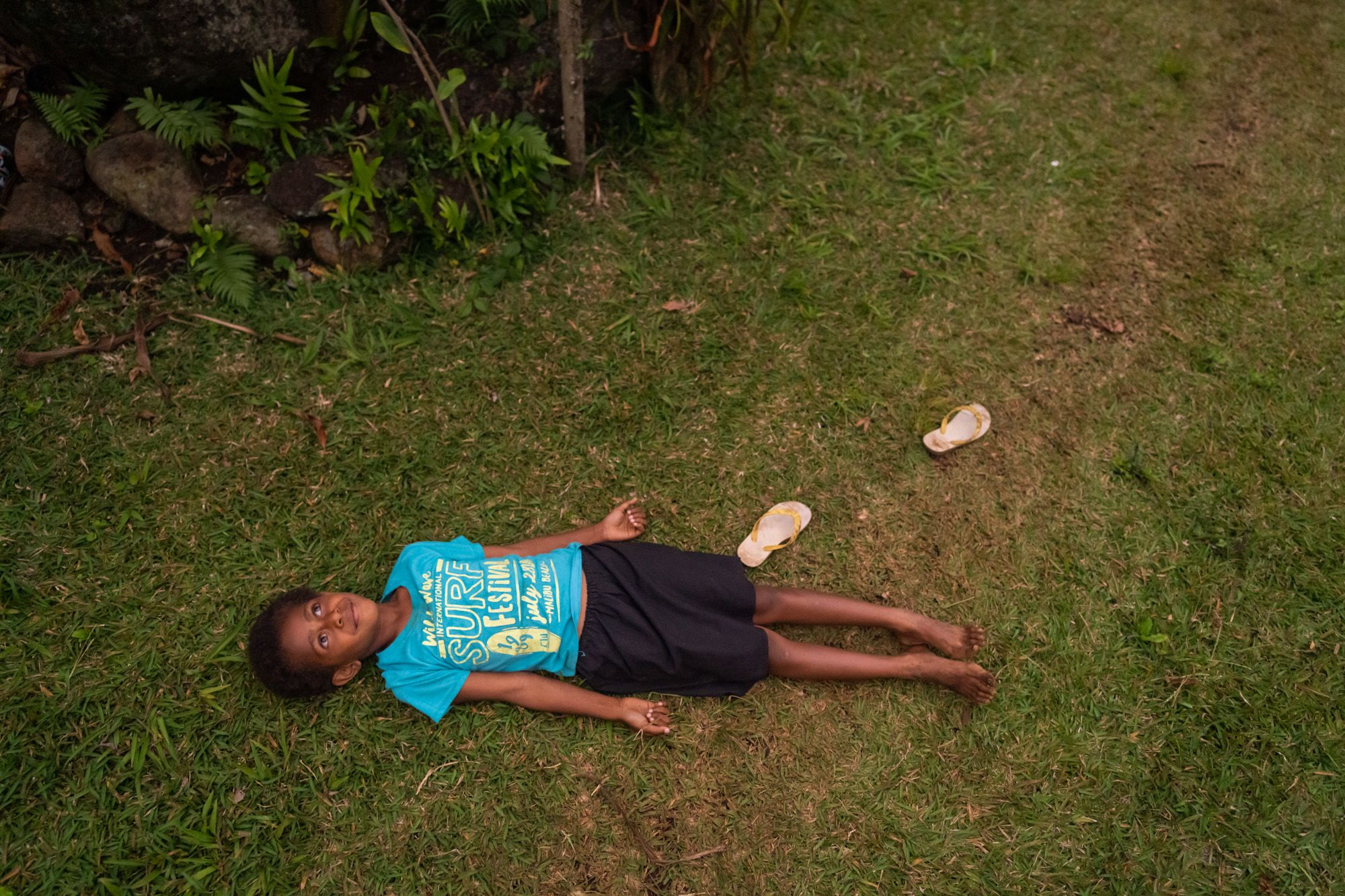 “Charlie is a tactile teenager. His keen interest in the world around him is shown by his equal parts curiosity and excitement as he looks into the trees or across the turquoise ocean that surrounds his island home. Hunting is one of Charlie's favourite activities, and it means a lot to come home with food in hand for his parents and seven siblings. This photo was taken after he’d caught a fish with his homemade catapult that he uses to catch fish and squid.”