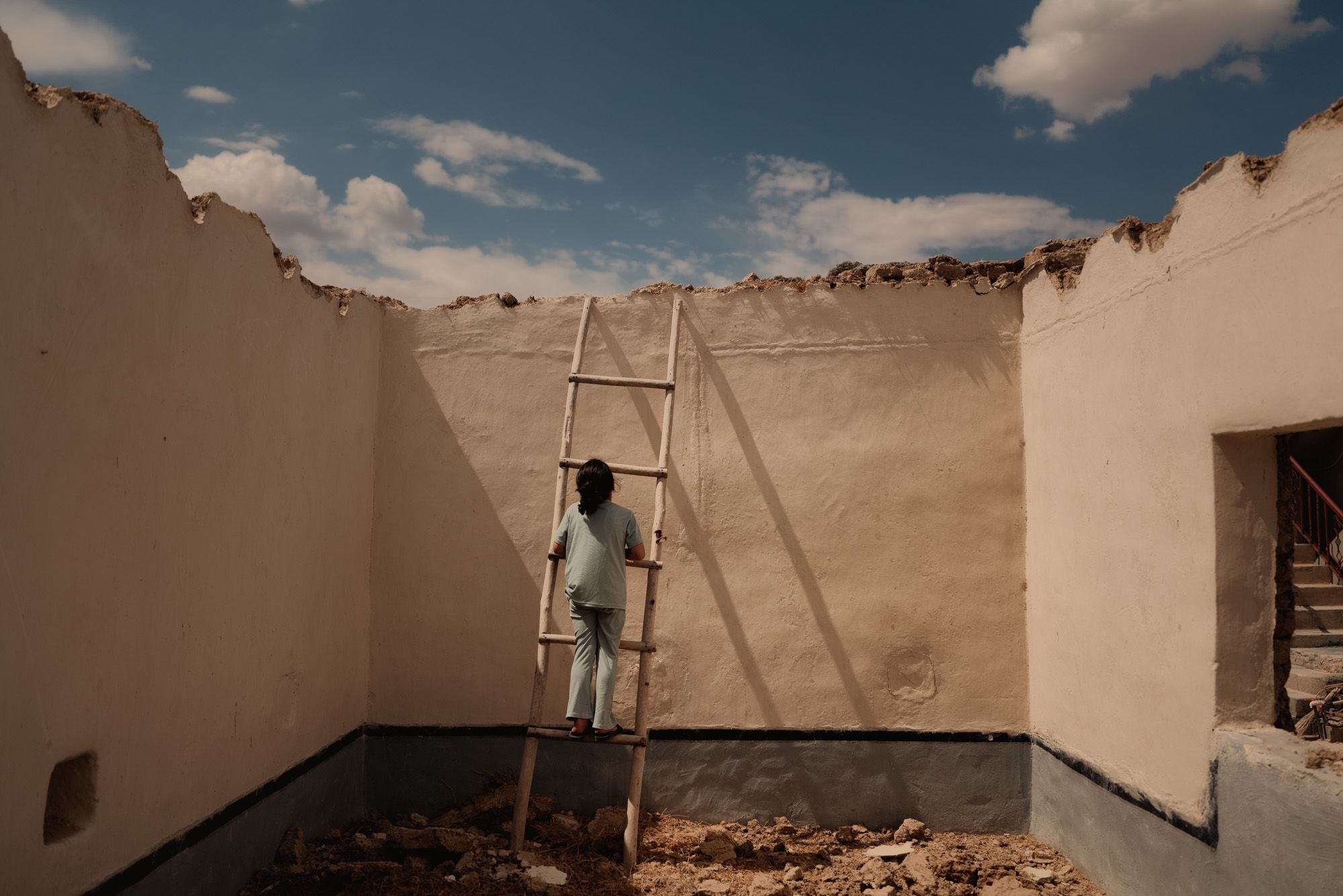 Athaab's*, daughter Qadar* climbs a ladder in a destroyed building, Sinjar, northern Iraq. Photographer: Emily Garthwaite. @emilygarthwaite