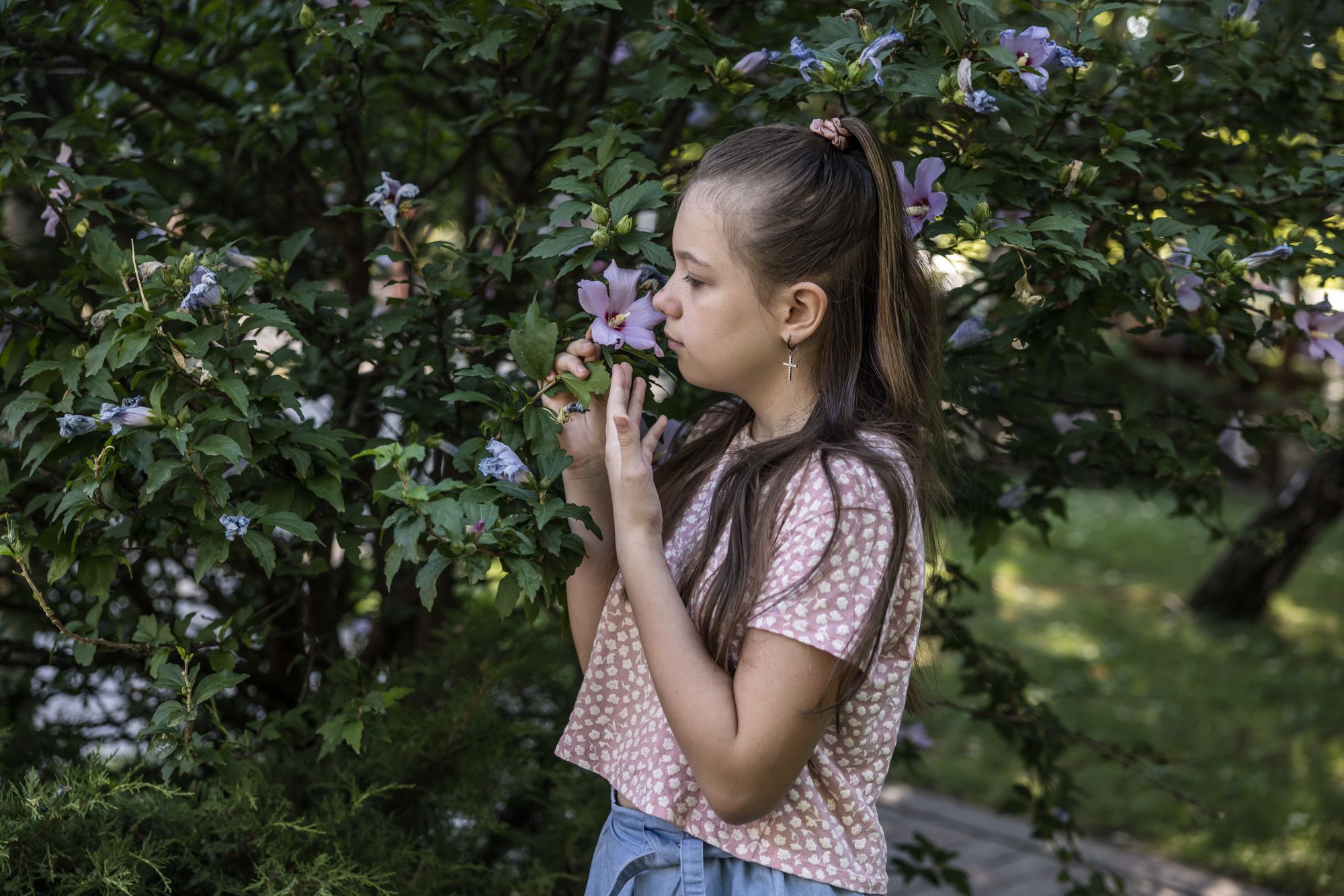 Alia*, 11, looking at flowers at her local park in Bucharest, Romania. Photographer: Oksana Parafeniuk. @oksana_par