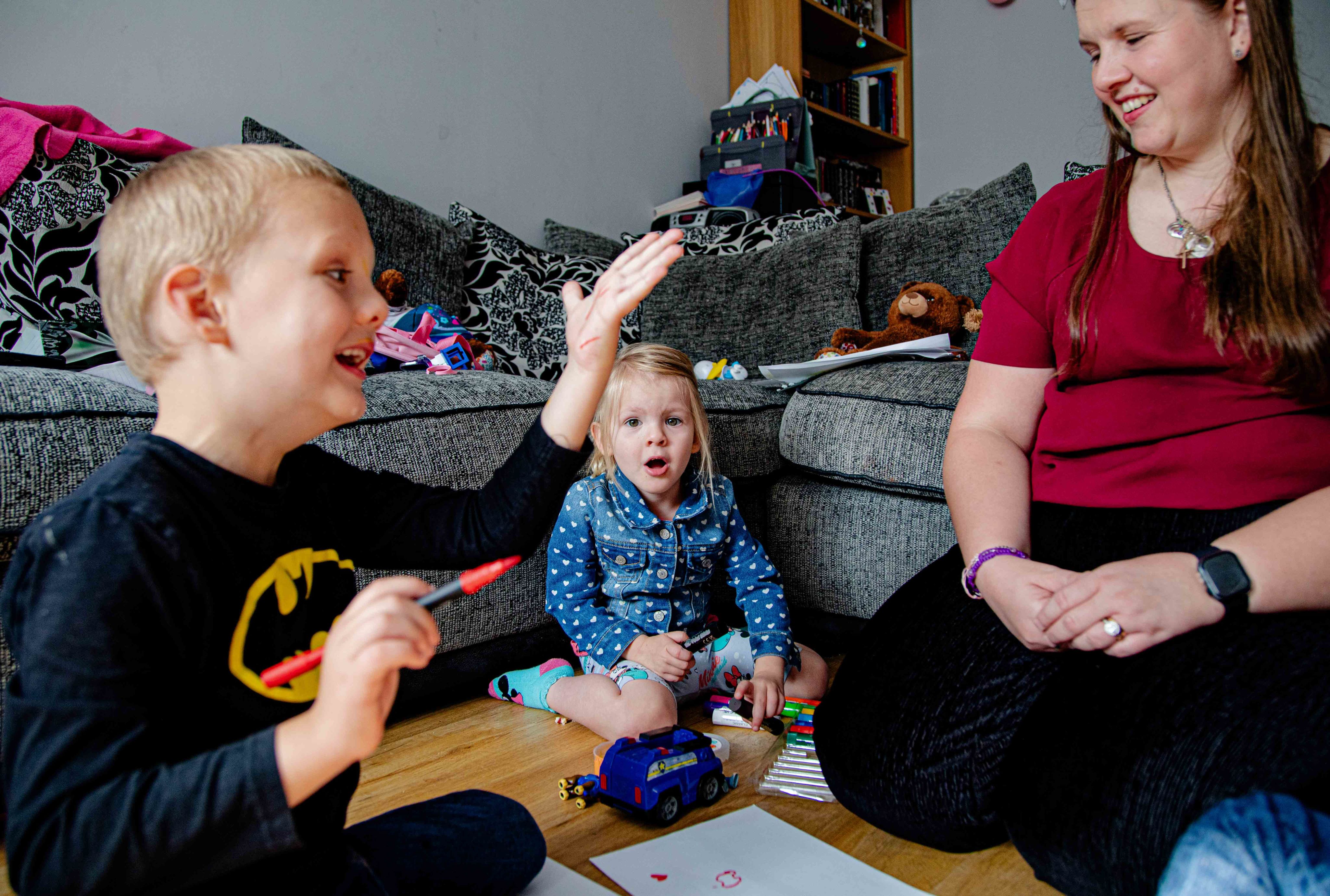 Owain, 4, Bethan, 3, and mum, Mary, at home in Cardiff. Photographer: Anna Sass. @anna.sass_