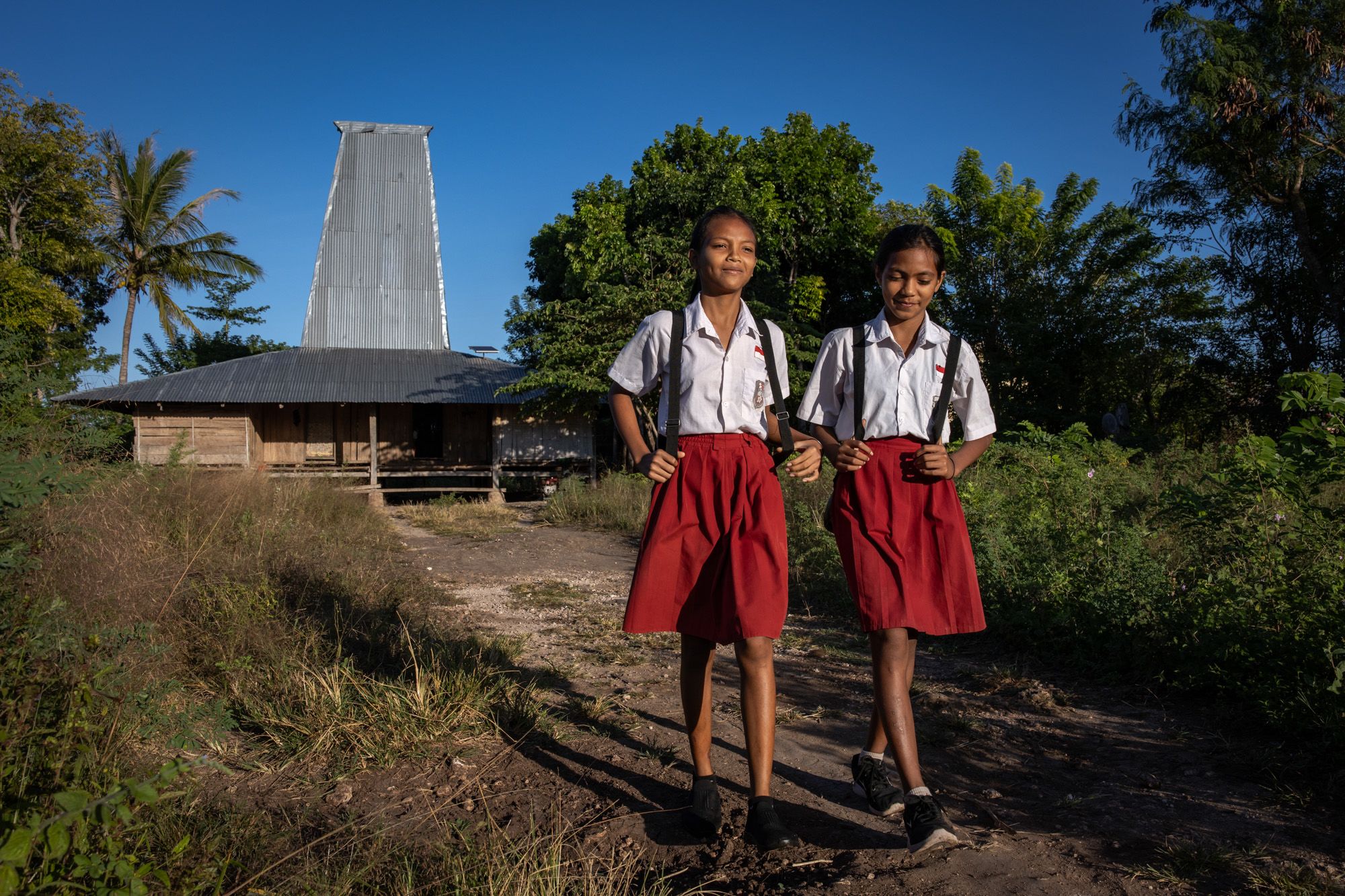 “Atika and Dwi are cousins. They are very close as cousins but also as friends. They are very connected, they’re the same age, and want to share everything together. When we arrived in their village it was around 6am, and they were preparing for school. It was a very nice light and in the background is Atika’s house, a traditional house of the Sumba people with tall, pitched roofs that tower up to the sky.”