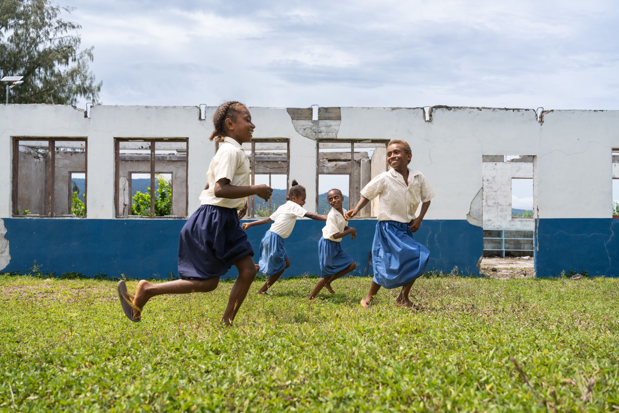 Children playing outside a school destroyed by a cyclone on an island in Shefa Province, Vanuatu. Photographer: Conor Ashleigh. @conorashleigh