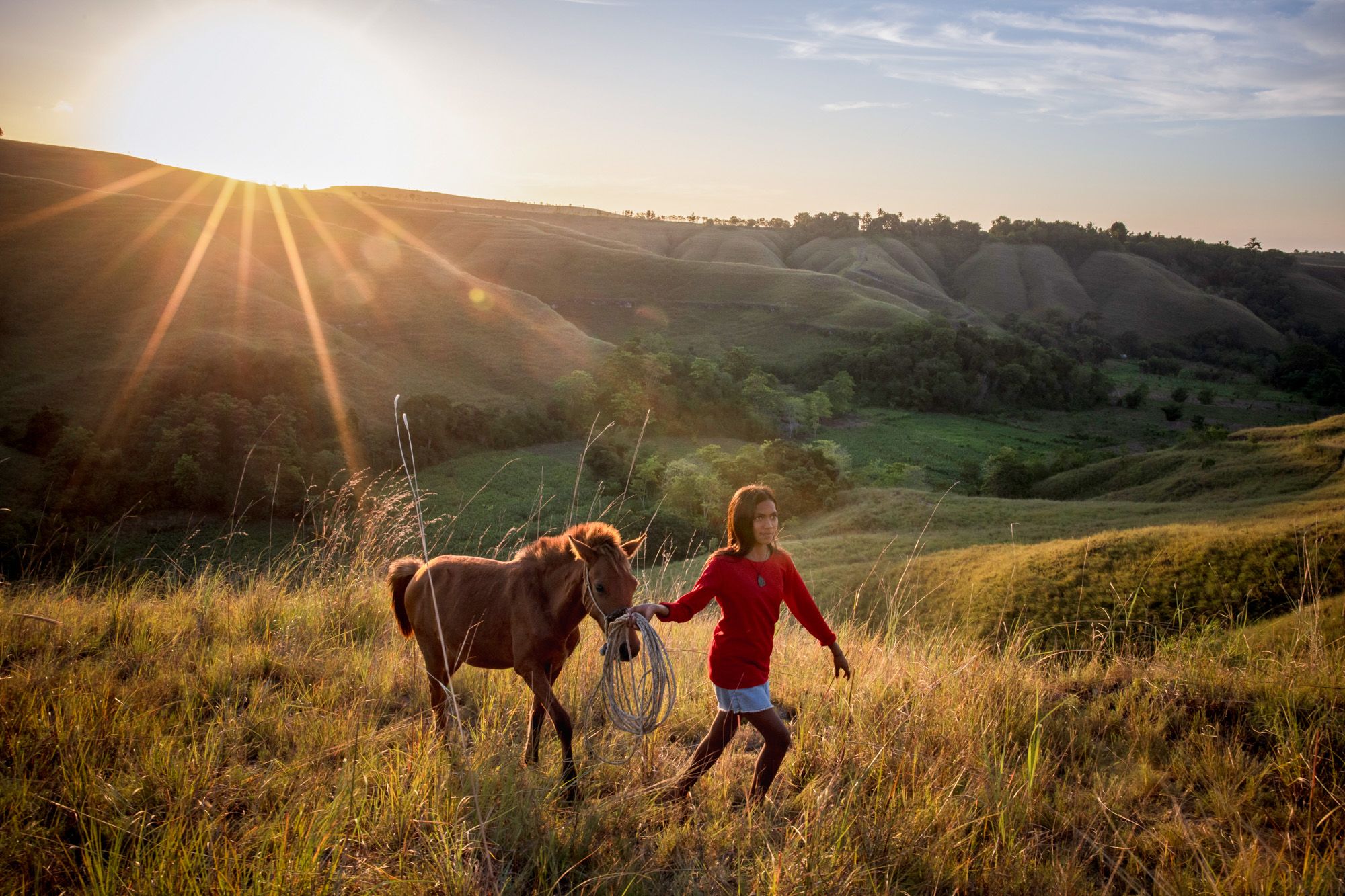 “This photo was taken in East Sumba. It’s such a beautiful island. There are horses everywhere, savanna; lots of beauty. In this image, Atika is walking with her neighbour’s horse, climbing up the valley. We were photographing the daily life of Atika and her family in her community. It was taken around 5pm in golden hour, the lighting was very nice. Horses are a very important part of Sumbanese culture. The horse is part of their family, and their life, and is so important to them.”