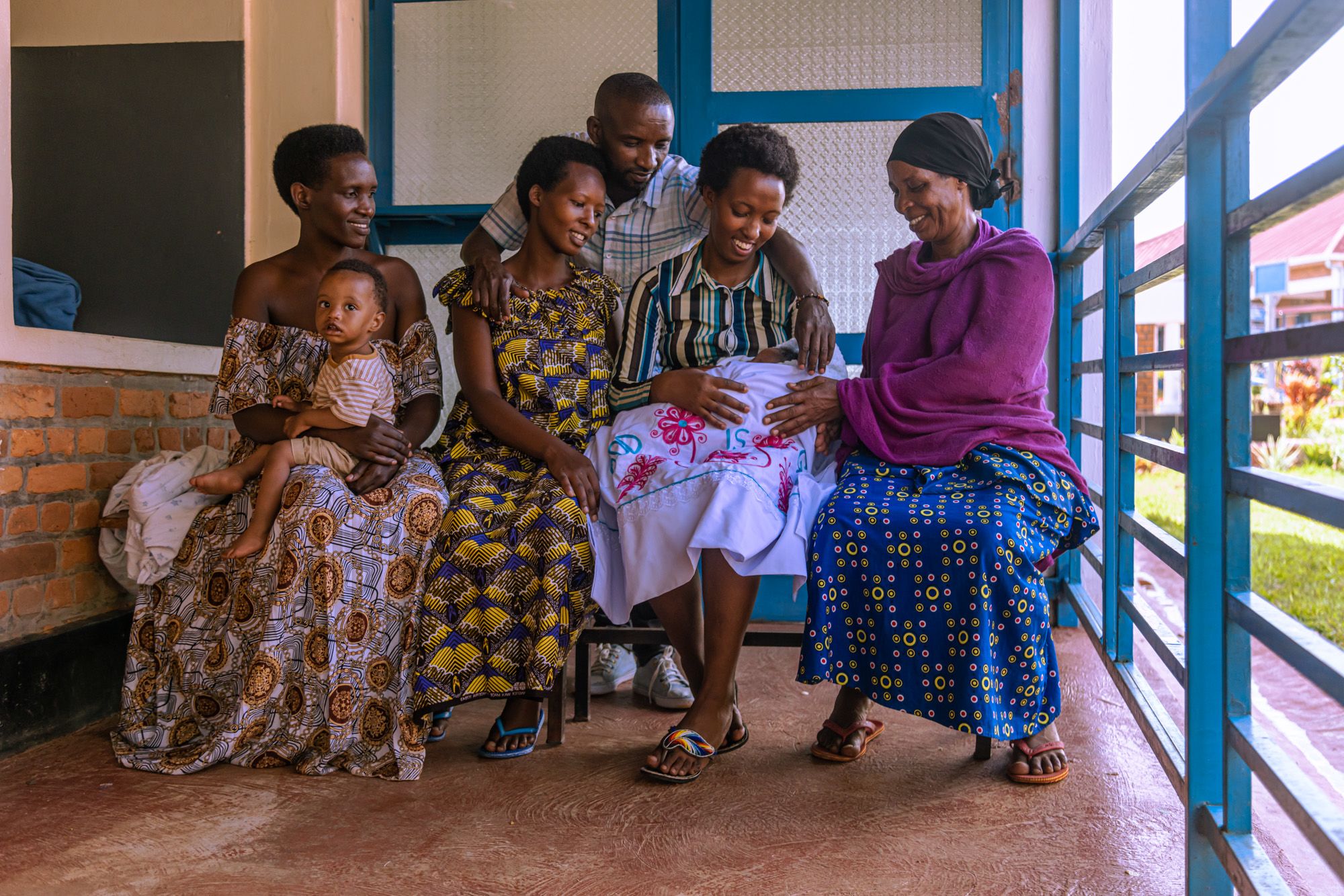 A family portrait of Claire*, her newborn baby, Aimé*, husband, sister and mother outside the maternity ward of a medical facility run by Save the Children in Mahama Refugee Camp, Rwanda. Photographer: Yagazie Emezi. @yagazieemezi