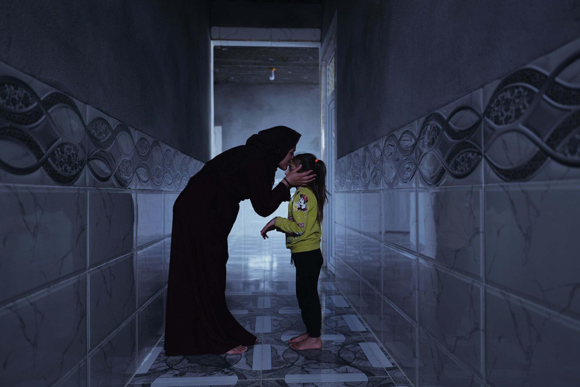 “I asked if we could explore her home further, and the corridor, with its newly polished reflective floors, eventually became the setting for our photographs. Initially, I captured a portrait of Athaab, but then her daughter ran into the frame. Here, she is being kissed and then gently told to get out of the photo. I loved the corridor; it felt like a tunnel, a stepping stone into an unknowable future, and the blue hues felt contemplative.”