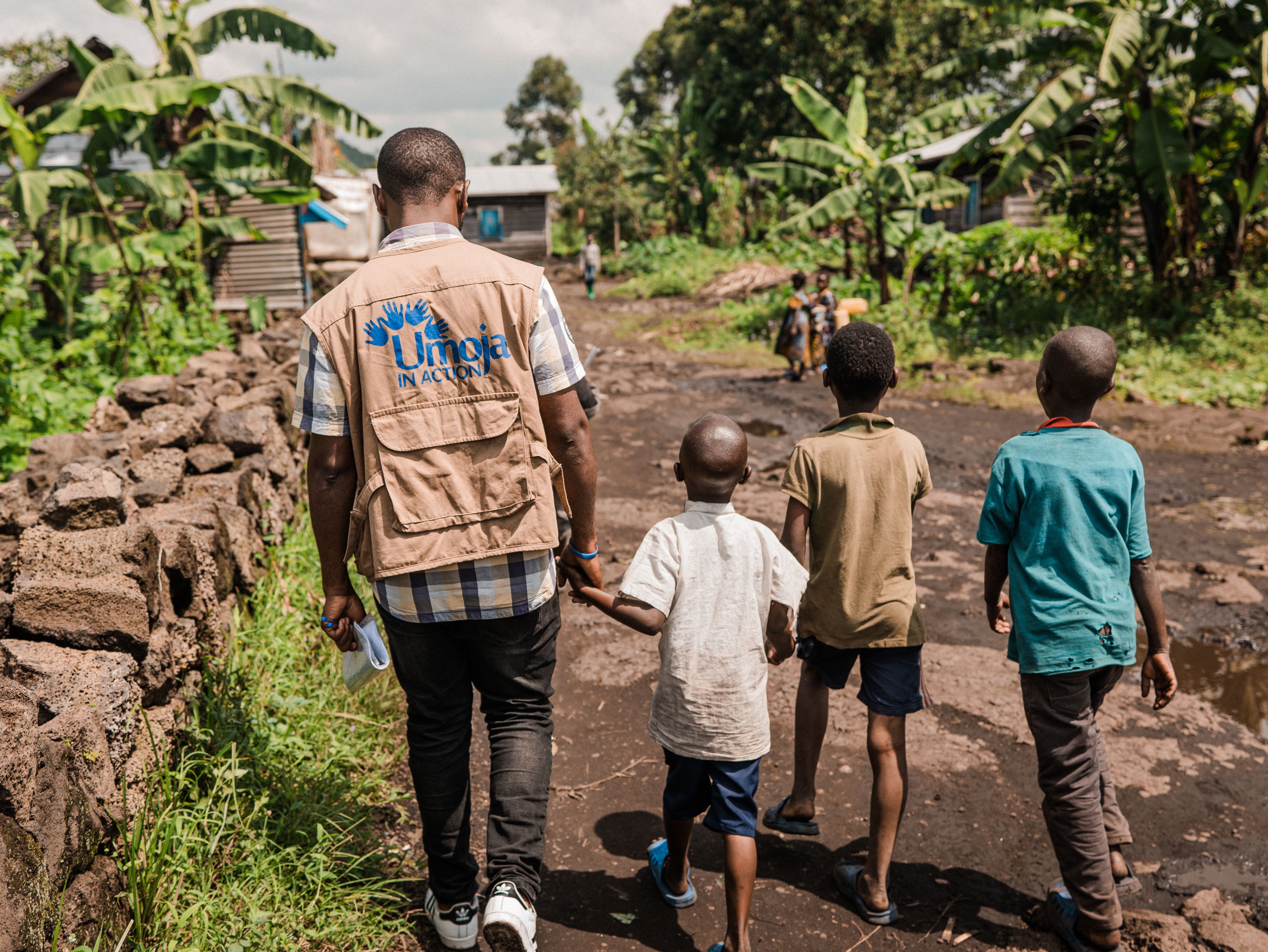 Children walk to a Child Friendly Space with partner staff member Bweya, from Umoja in Action. Credits: Hugh Kinsella Cunningham /Save the Children.