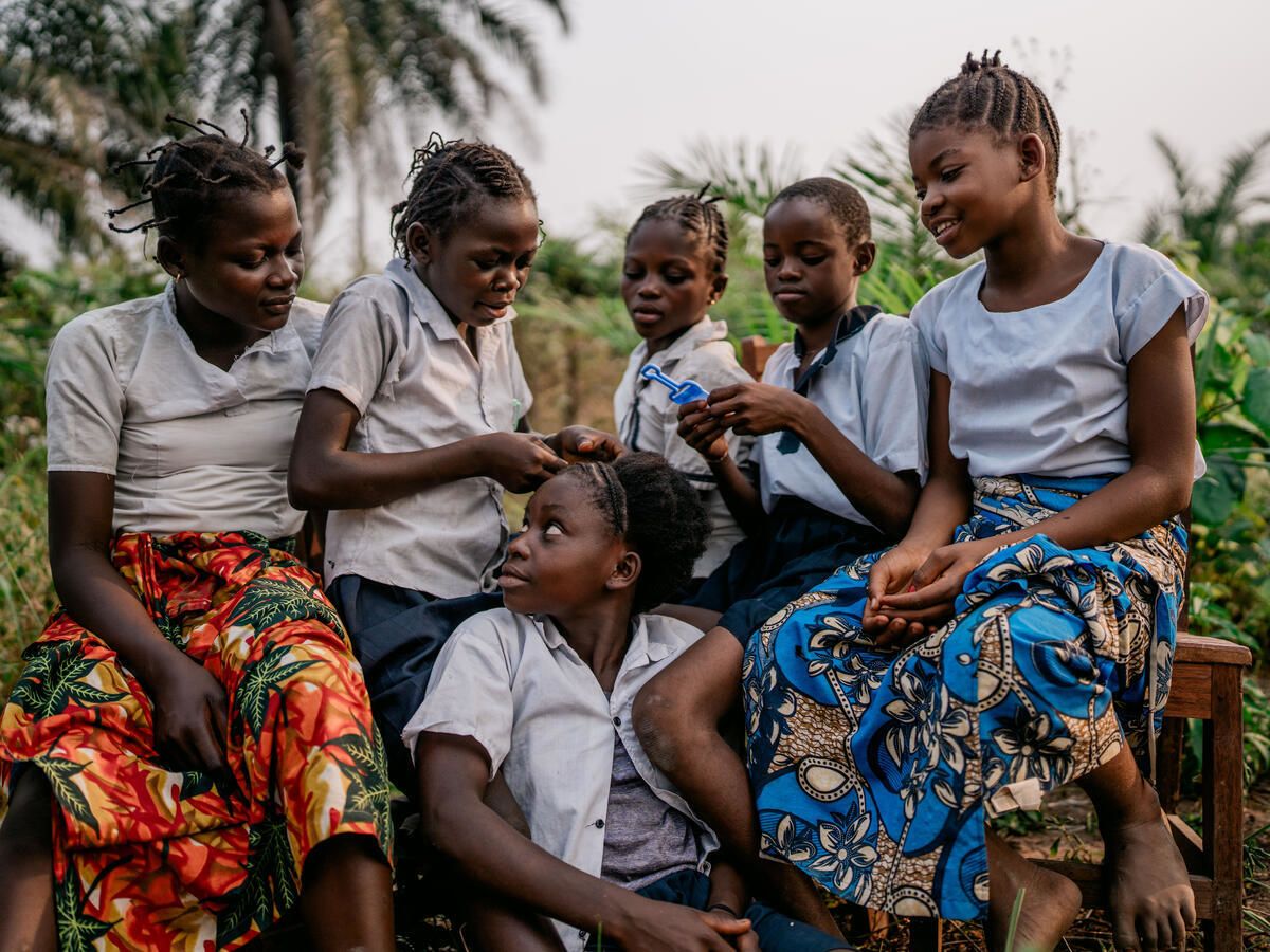 Adel (right) and her friends chat and braid Marie's hair after school in Kasai, DRC. Photographer: Hugh Kinsella Cunningham @hughkinsellacunningham