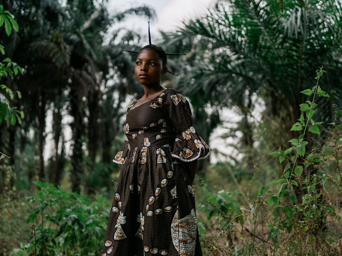“Mbombo naturally posed for portraits with a serious expression – a contrast from how teenagers normally behave in front of the camera. But while her father’s attempt to marry her took its toll, he couldn’t take the last years of her childhood. I asked Mbombo if she had a favourite thing she had sewn. She dashed across the village and returned wearing this dress. This grove of palm trees is right behind her school. The choice has a hidden meaning in this photo – a walk to school or to fetch water can be fraught with danger for girls here.”