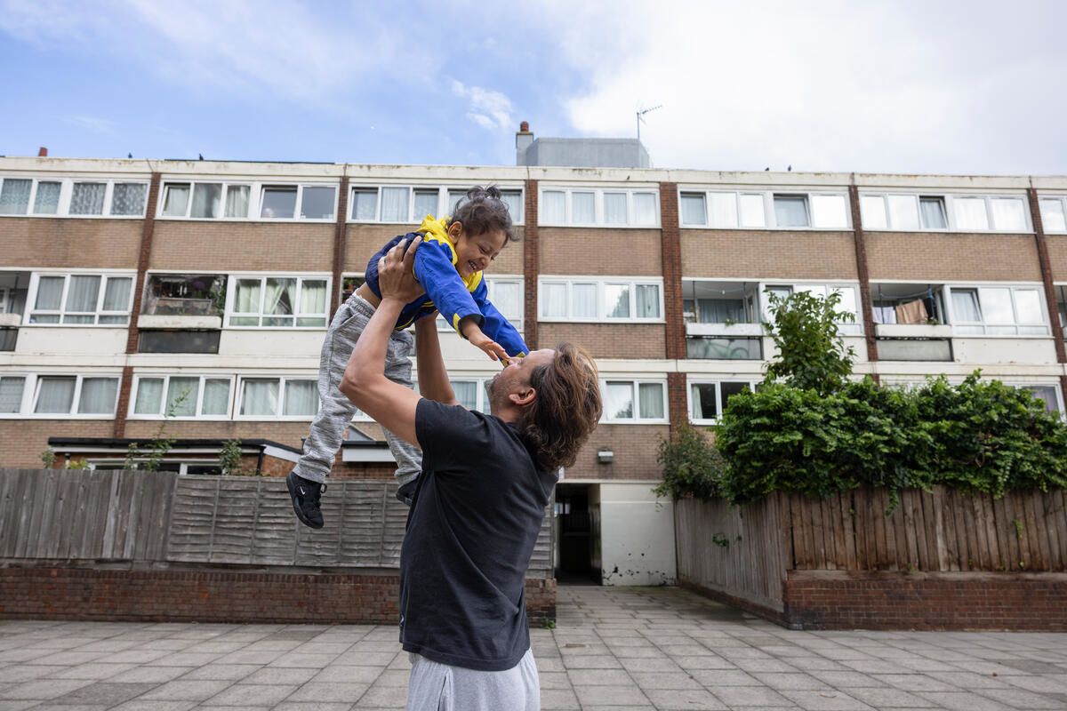 3-year-old Yuaan plays with his dad, Razzak, outside their home in Tower Hamlets, London. Photographer: Kate Stanworth. @katestanworth