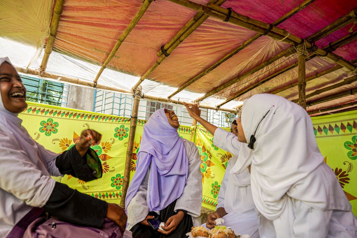 “For me, this photograph is a reminder that even in challenging situations, there are moments of pure joy and innocence. We joined Amina* and her friends as they walked through the busy lanes, full of laughter. They wanted to show us a local street vendor who sold fuchka, deep-fried spheres filled with ingredients like spiced potatoes, chickpeas, and onions. They stood around the small cart, laughing, teasing one another, and urging me to try. They even fed me themselves. All I could do was be present in that moment with them.”