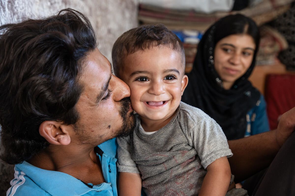 Hamoudi* kisses his 1-year-old son, Majid*, at home in North East Syria. Photographer: Jonathan Hyams. @jonnyhyams