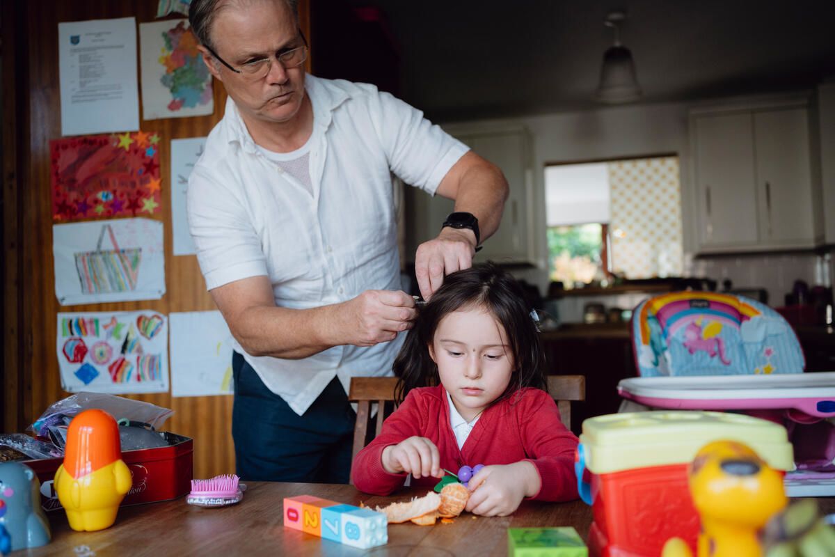 Lily, 4, has her hair done by dad Phil, at home in Tower Hamlets, London. Photographer: Imogen Forte. @imogenforte