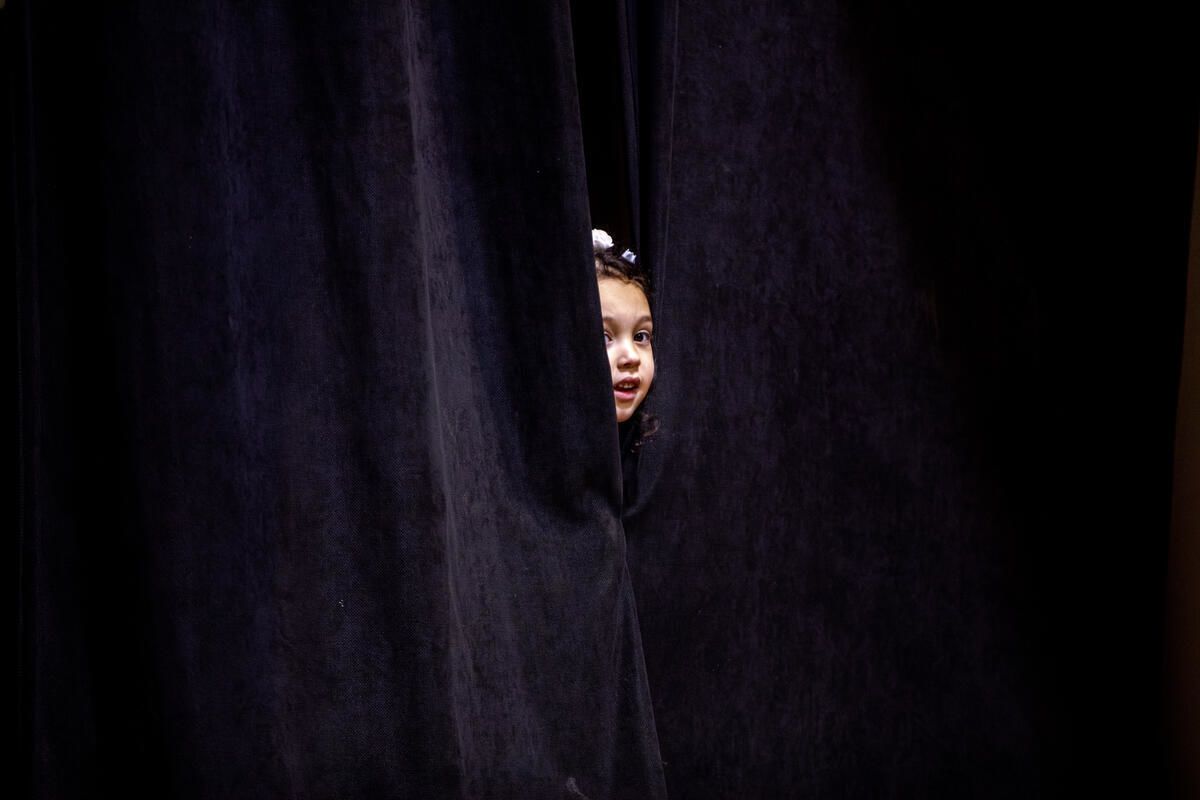 A girl peeks through a curtain during a theatre production at our safe space for children in Cairo, Egypt. Photographer: Anna Sass. @anna.sass_