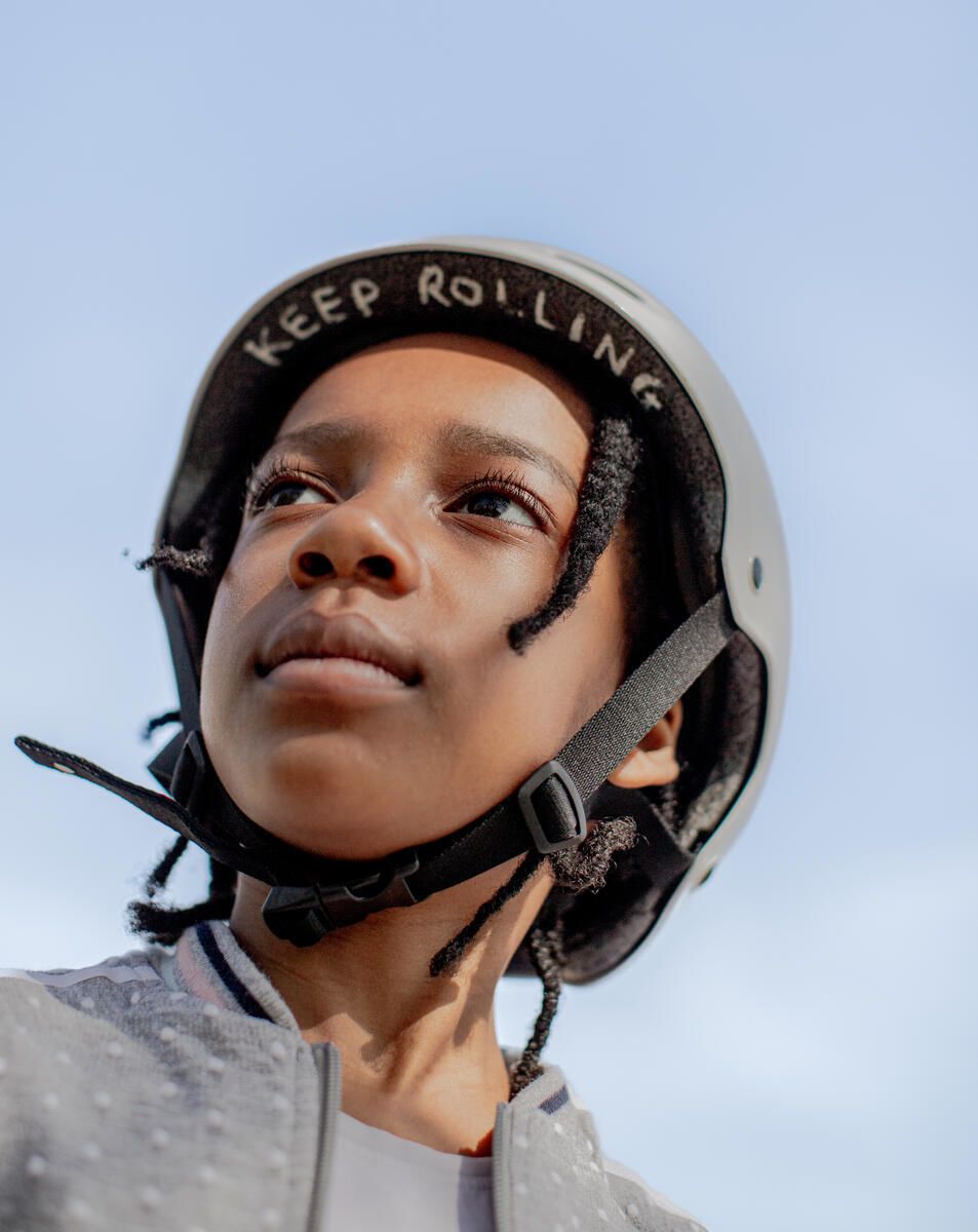 Cyrah, 7, pictured at SkateJam in a park in North London. Photographer: Anna Sass. @anna.sass_