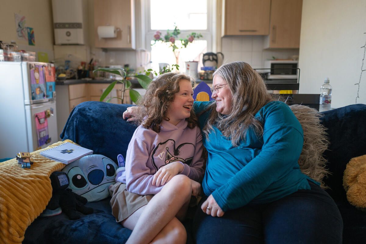 Eipril, 11, and her mum, Oleksa, giggle at home near Margate, Kent. Photographer: Anna Gordon. @annaggordon