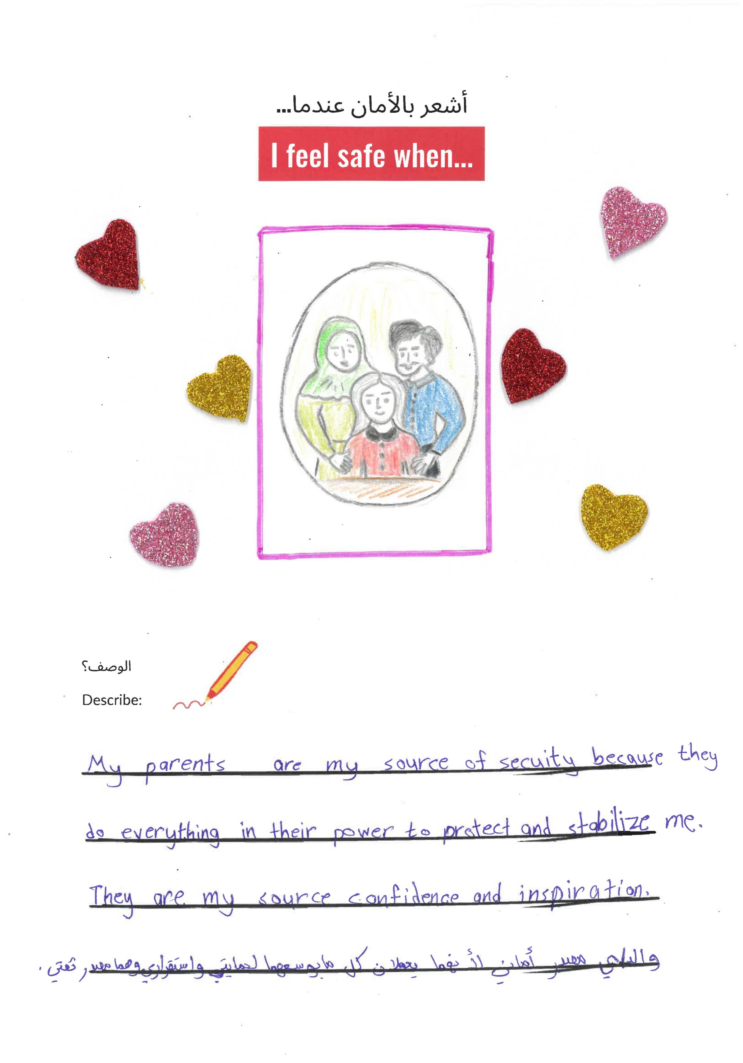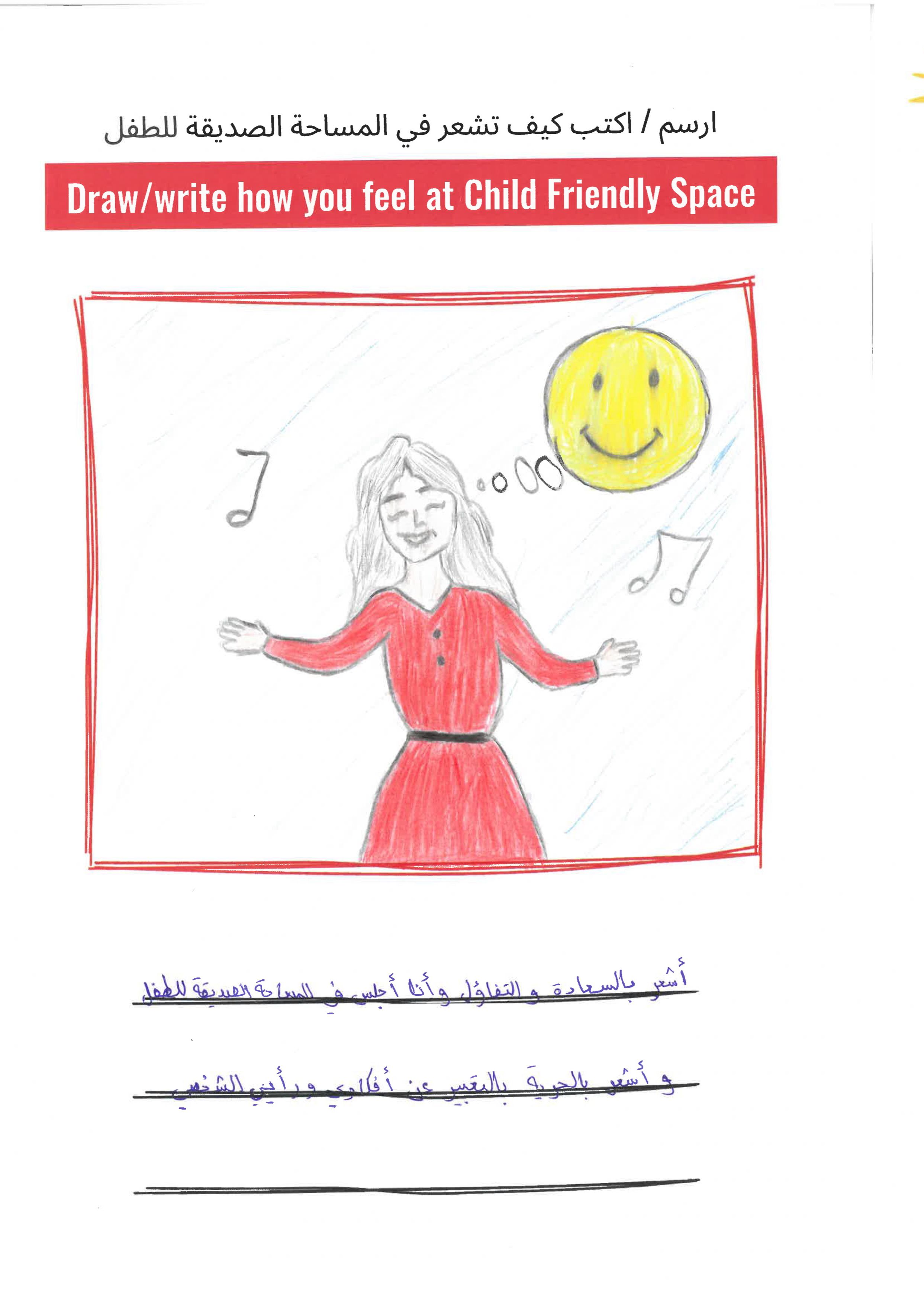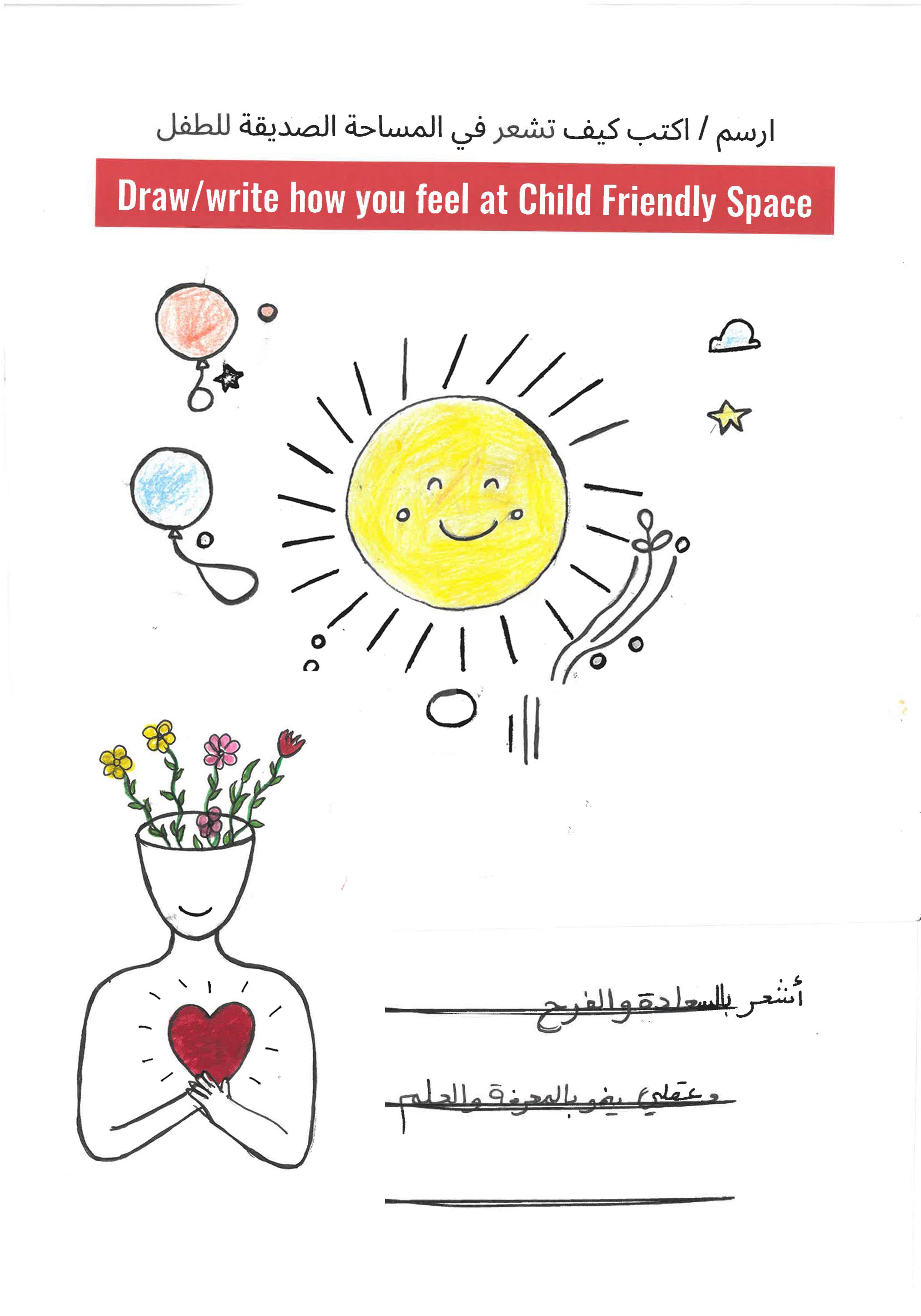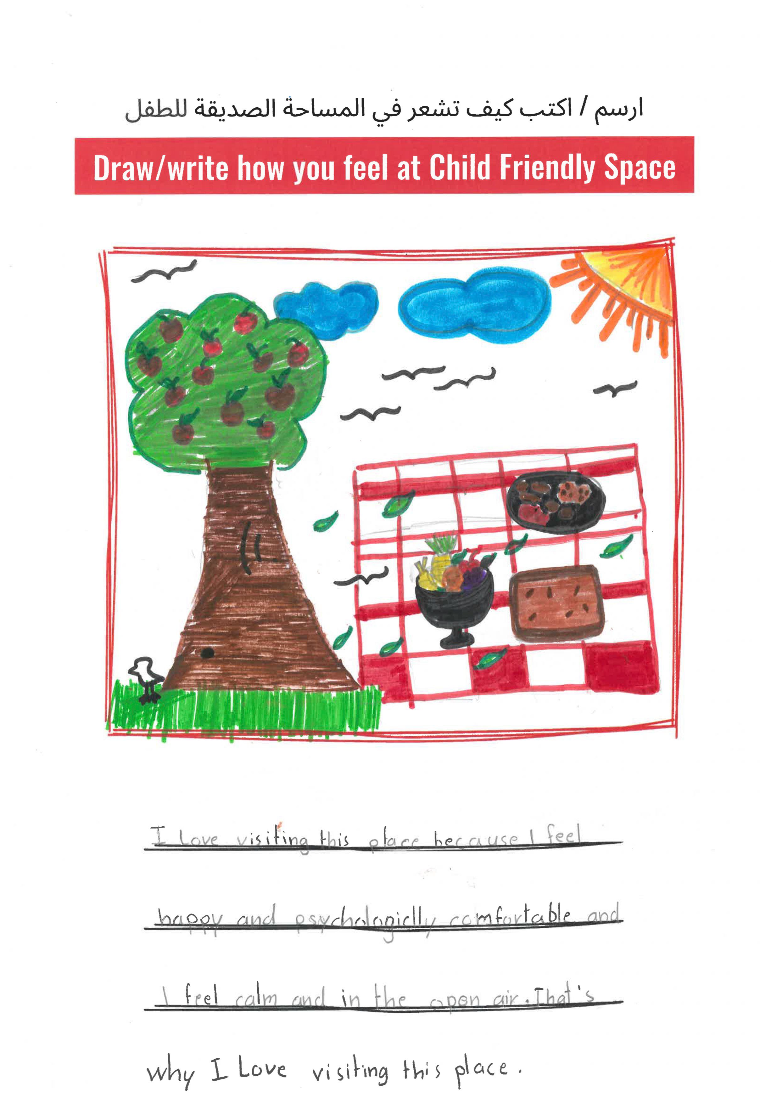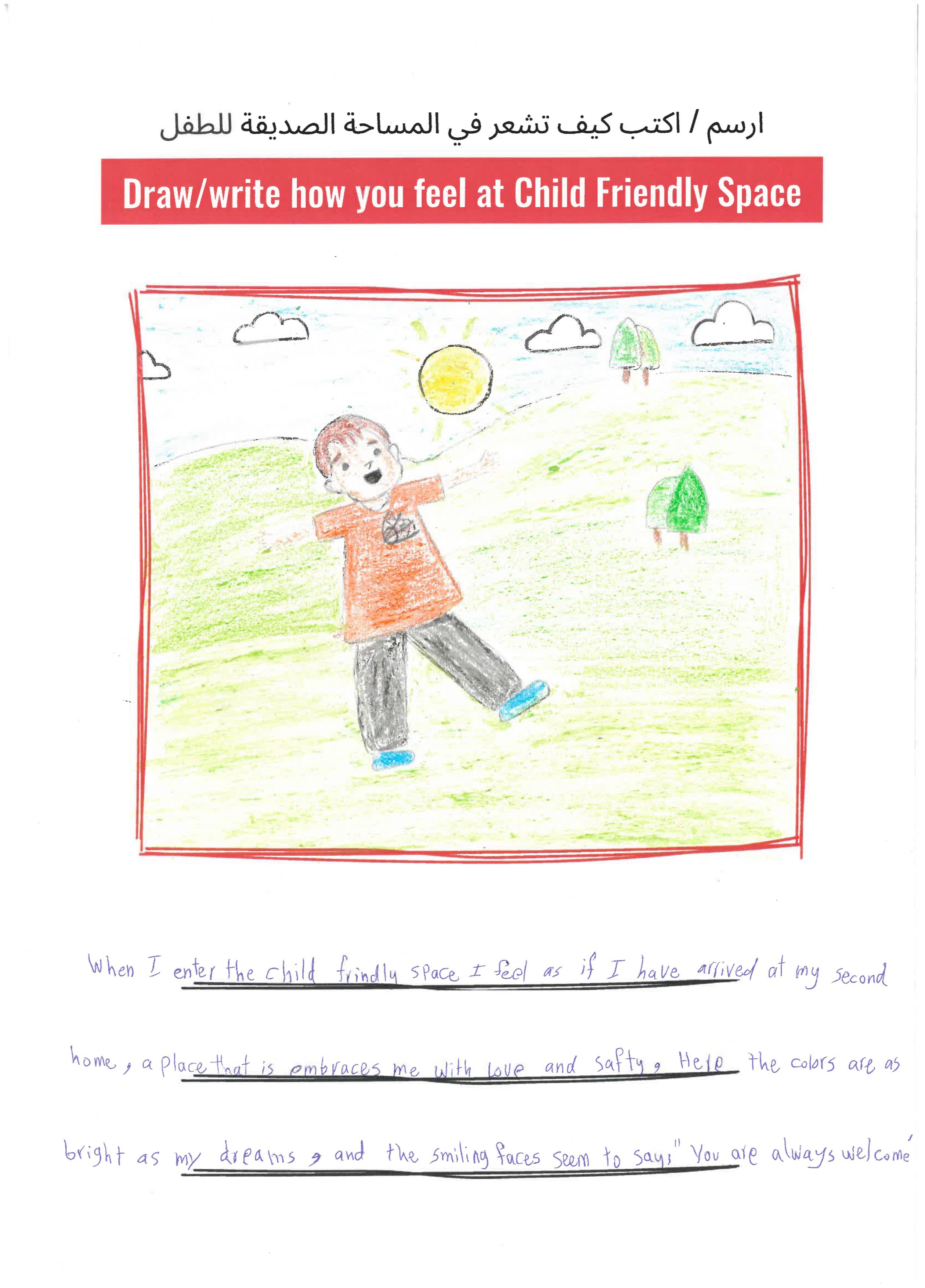 “When I enter the Child Friendly Space I feel as though I have arrived at my second home, a place that embraces me with love and safety. Here the colours are as bright as my dreams and the smiling faces seem to say “You are always welcome” ”