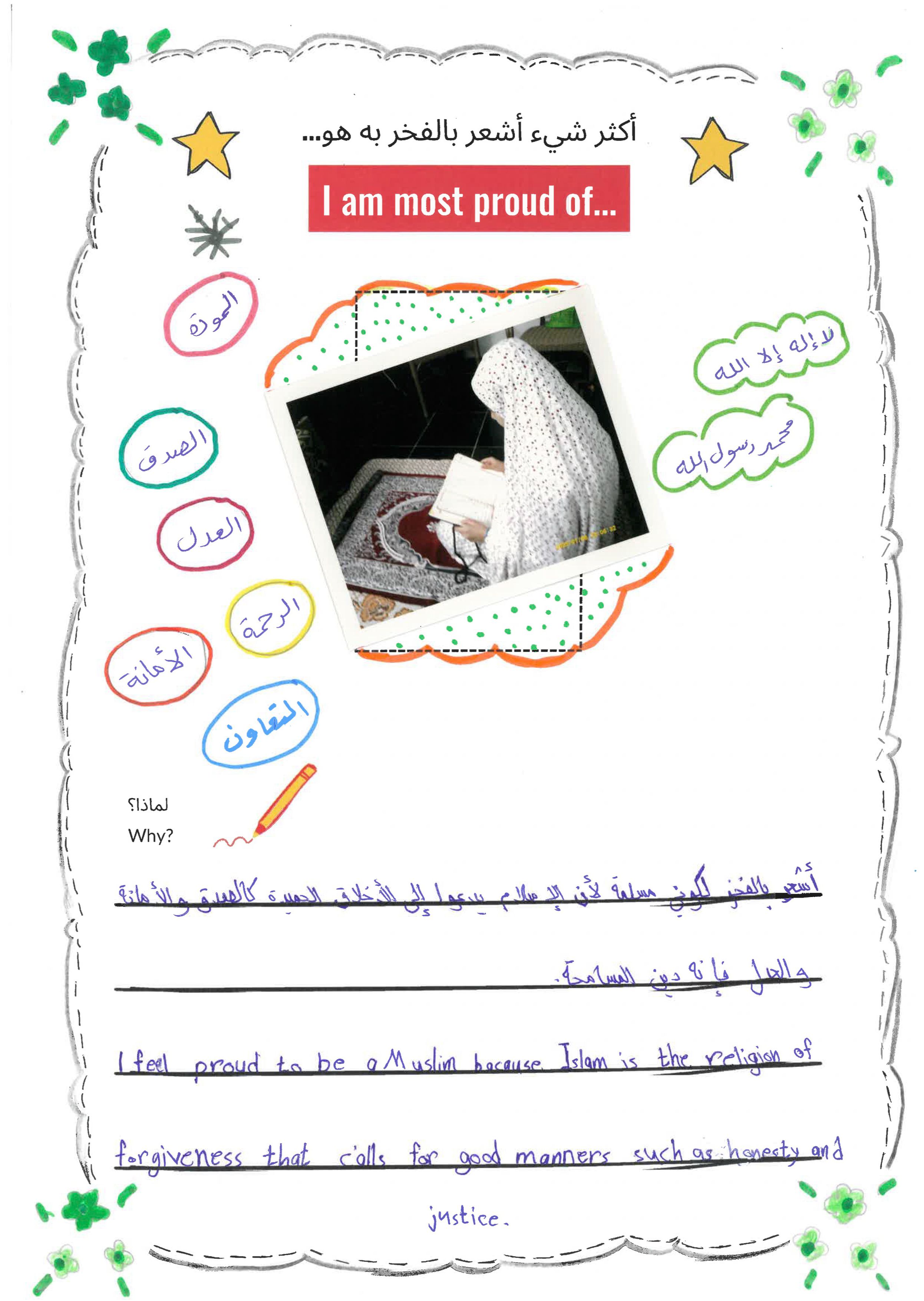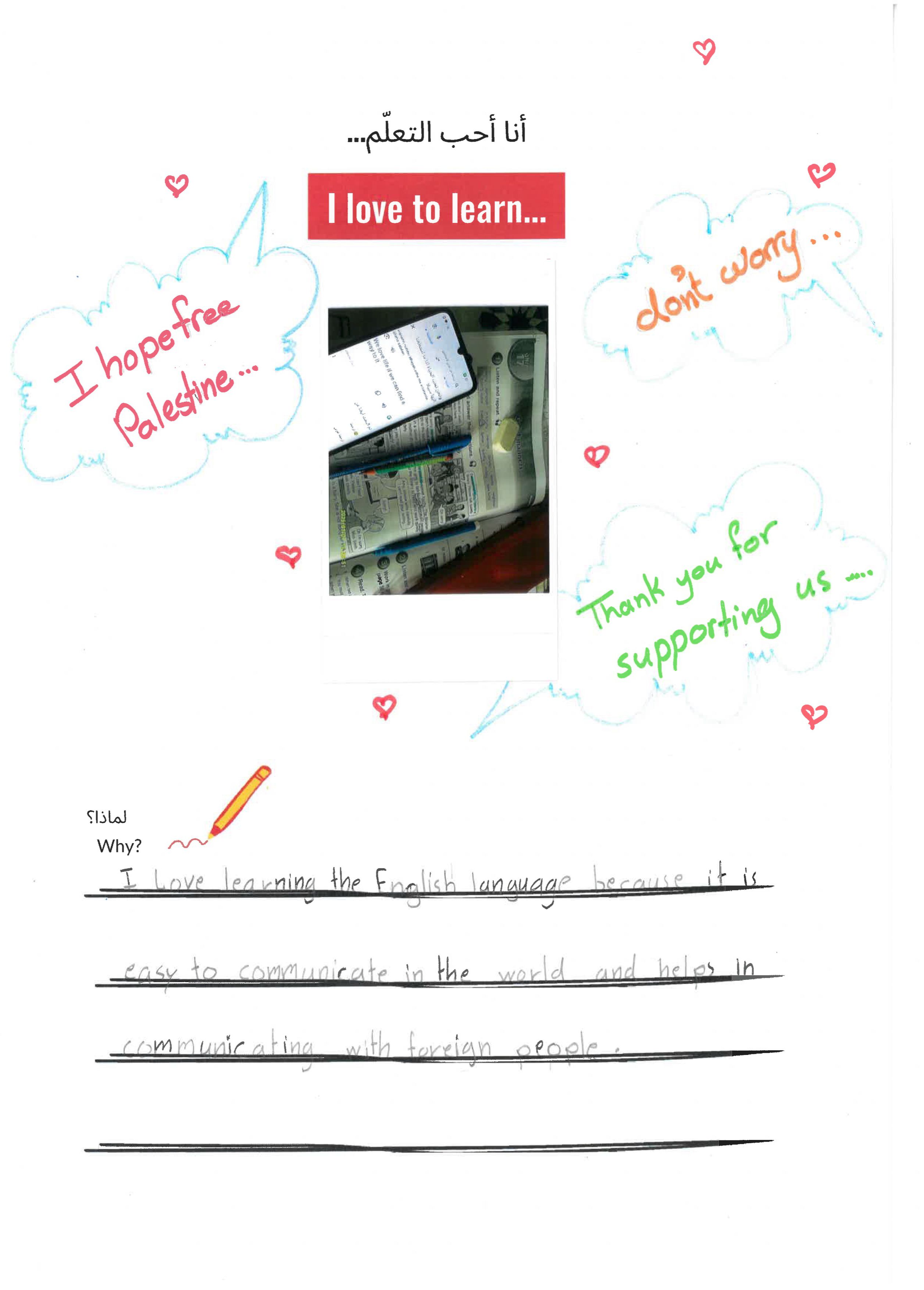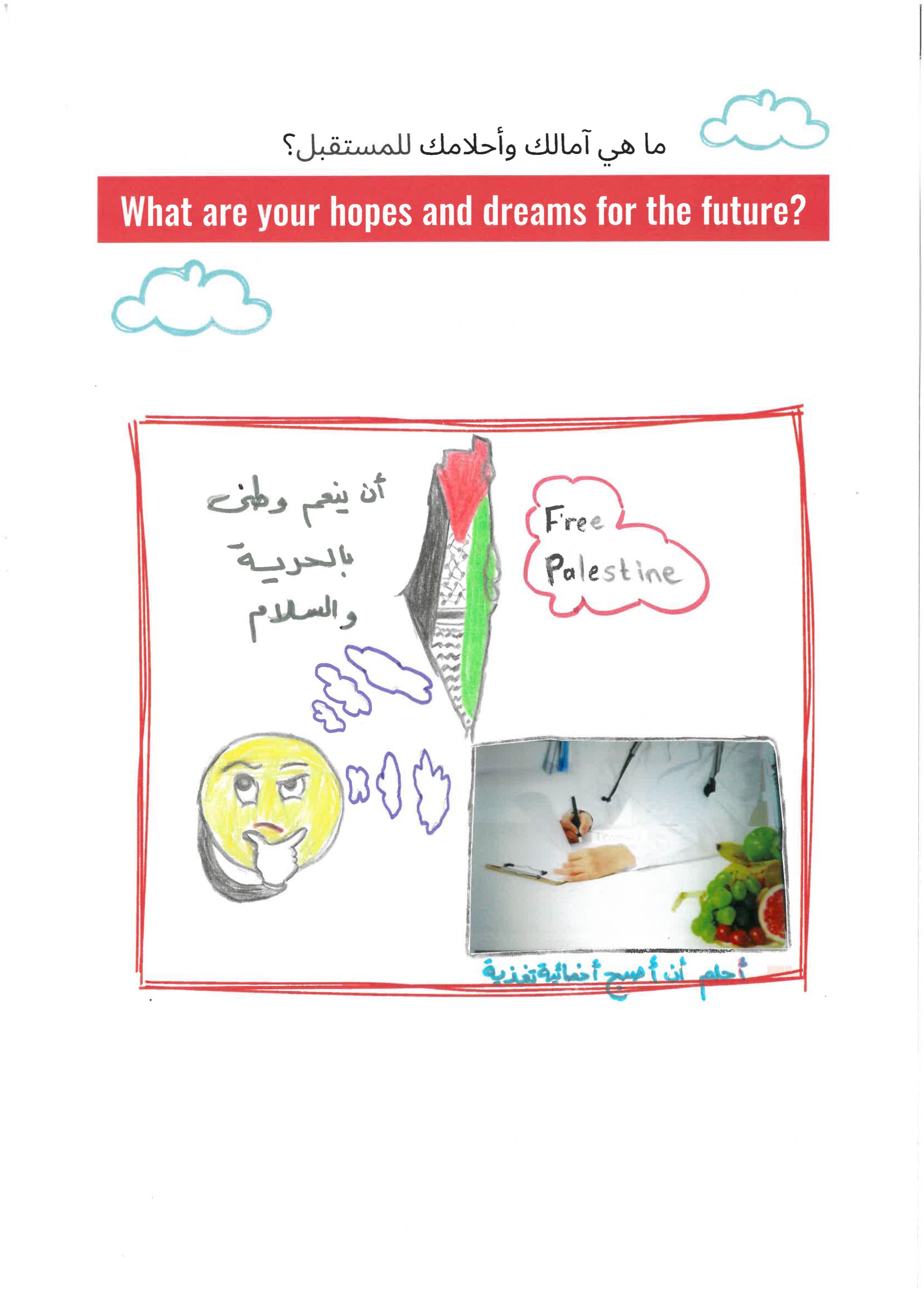 “I feel proud that I am Palestinian. I feel proud that I am a child with my own identity and feel I have a positive future. I will work hard until I return to my country and home, Gaza, where I was born and raised.”