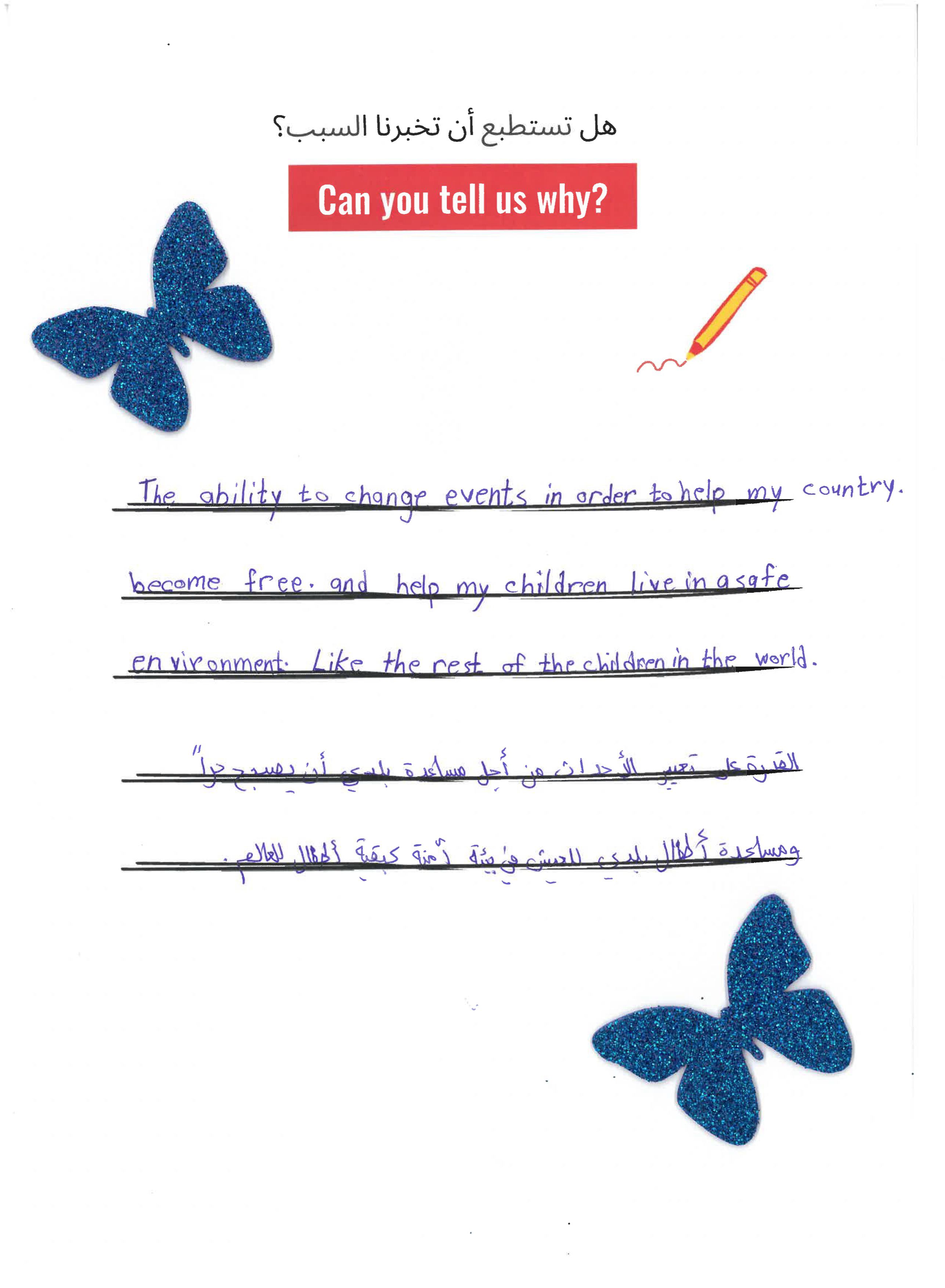 "My Superpower would be the ability to change events in order to help my country become free and help my children live in a safe environment. Like the rest of the children in the world"